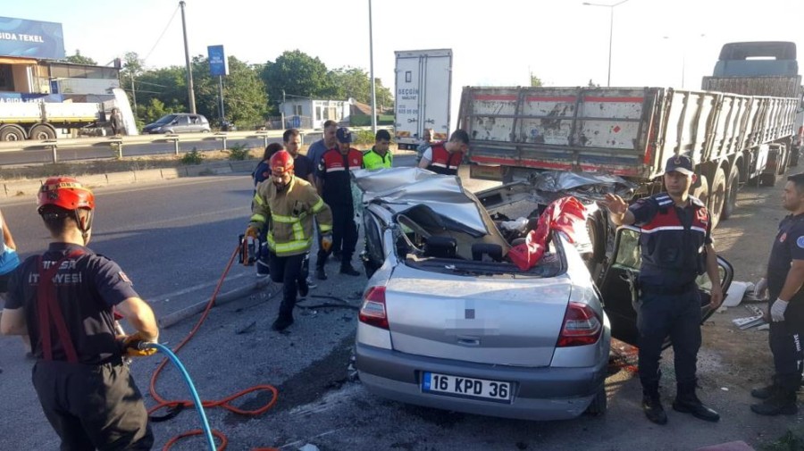 Sabaha karşı saat 05.30 sıralarında Bursa - İzmir karayolundan Bursa yönüne seyreden Orhan Çalışkan'ın (46) kullandığı 16 KPD 36 plakalı araç, Uluabat Mahallesi'nde park halinde bulunan ve içerisinde Harun T.'nin (42) uyuduğu 35 BDJ 710 plakalı çekiciye bağlı 35 AJN 345 plakalı dorseye arkadan çarptı.