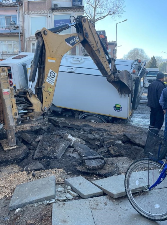 Olay İnegöl ilçesi Cuma Mahallesi Hastane Caddesi üzerinde meydana geldi. Kazı çalışması yapılan alanın yanından geçen temizlik kamyonunun ağırlığını kaldıramayan yol çöktü.