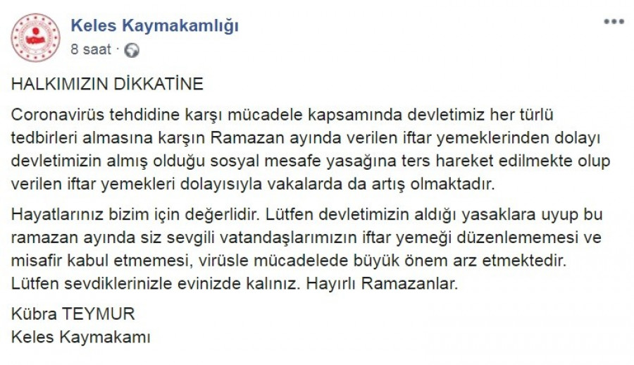 Konuyla ilgili bir açıklama da Keles Kaymakamı Kübra Teymur'dan geldi. Kaymakam Teymur yaptığı açıklamada, "Korona virüs tehdidine karşı mücadele kapsamında devletimiz her türlü tedbirleri almasına karşın Ramazan ayında verilen iftar yemeklerinden dolayı devletimizin almış olduğu sosyal mesafe yasağına ters hareket edilmekte olup verilen iftar yemekleri dolayısıyla vak'alarda da artış olmaktadır. Hayatlarınız bizim için değerlidir. Lütfen devletimizin aldığı yasaklara uyup bu Ramazan ayında siz sevgili vatandaşlarımızın iftar yemeği düzenlememesi ve misafir kabul etmemesi, virüsle mücadelede büyük önem arz etmektedir. Lütfen sevdiklerinizle evinizde kalınız. Hayırlı Ramazanlar" şeklinde konuştu.