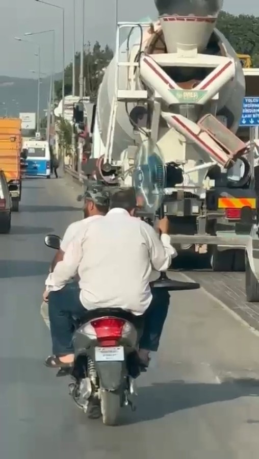 Merkez, Osmangazi ilçesi İzmir Yolu Caddesi üzerinde seyir halindeki elektrikli bisiklet sürücüsü arkasında bulunan arkadaşıyla serinlemek için çareyi vantilatörde buldu.