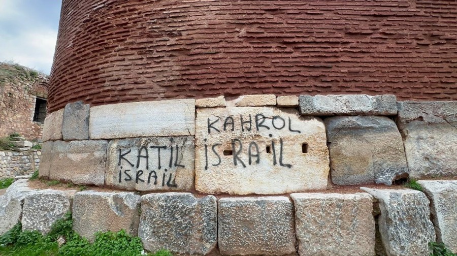 Medeniyetlere başkentlik yapmış Bursa'nın tarihi İznik ilçesinde 2 bin yıllık surlara sprey boya ile "Katil İsrail" yazdılar.