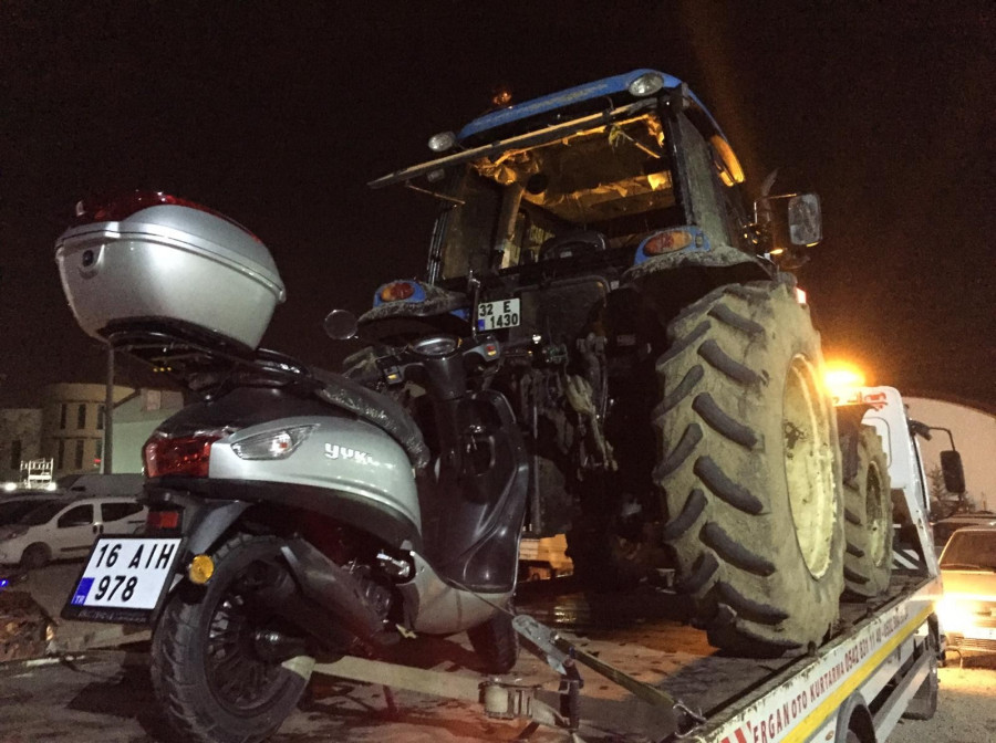 Bursa'nın İnegöl ilçesinde halindeki traktörün yağ fitresi patlaması sonucu yola dökülen yağ kazaya yol açtı. Motosiklet sürücüsü yağ sebebiyle direksiyon hakimiyetini kaybederek traktörün altına girdi. Yaralanan motosiklet sürücüsü hastaneye kaldırıldı.