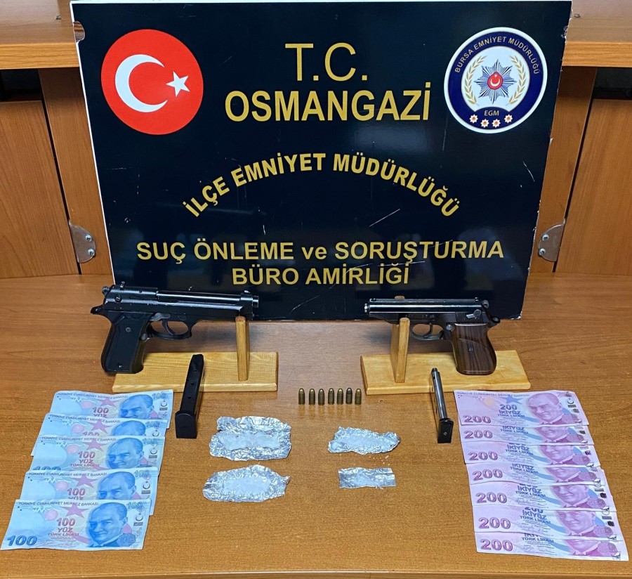 Bursa'da ruhsatsız tabanca karşılığında uyuşturucu madde alan şahıslar polisten kaçamadı.