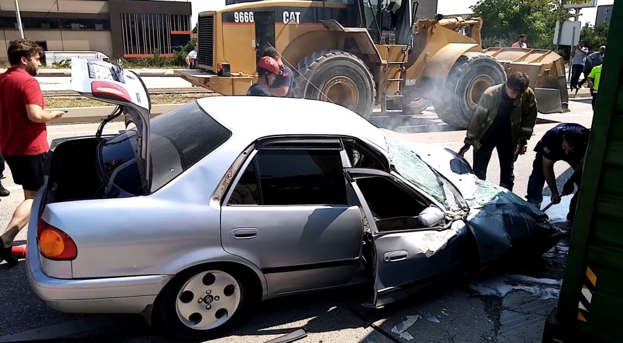 Bursa'nın İnegöl ilçesinde kontrolden çıkan tır otomobilin üzerine devrildi. Otomobil kullanılmaz hale gele gelirken, 1'i çocuk 2 kişi ölümden döndü.