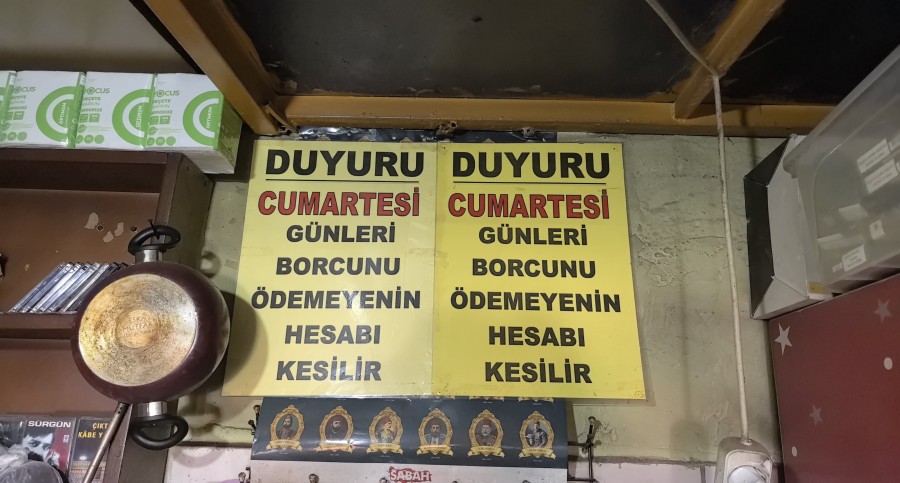 "Ayağınıza sigara istemeyin! Girin içeriden alın. Cumartesi günleri borcunu ödemeyenin hesabı kesilir. Kesinlikle veresiye istemeyin. Birazdan bırakırım, geçerken öderim, cumartesi yanındayım, aybaşı getireceğim, bıktık bu laflardan paran varsa al, yoksa alma."