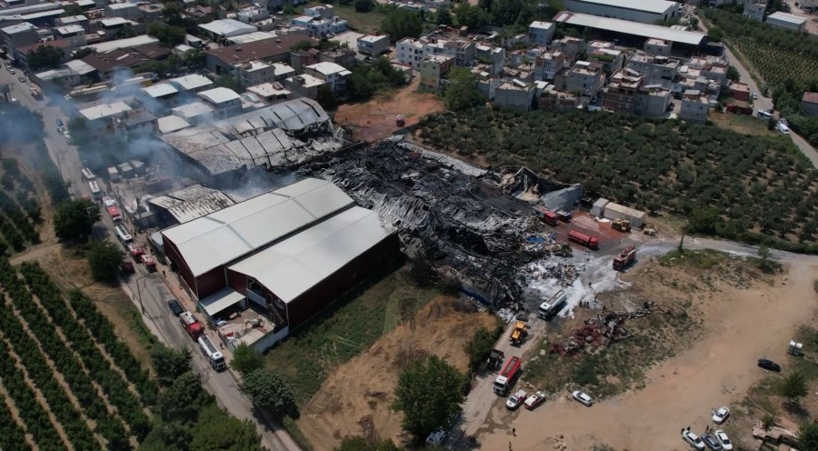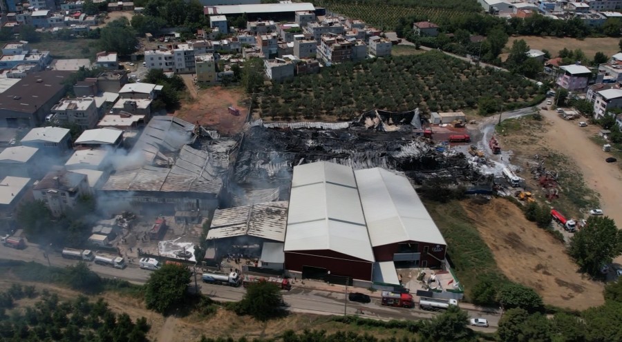Bursa'da bir fabrikada başlayan ve kısa sürede 3 fabrikaya daha sıçrayan yangın kontrol altına alındı. Soğutma çalışmalarının sürdüğü fabrikalar havadan dron ile görüntülendi.