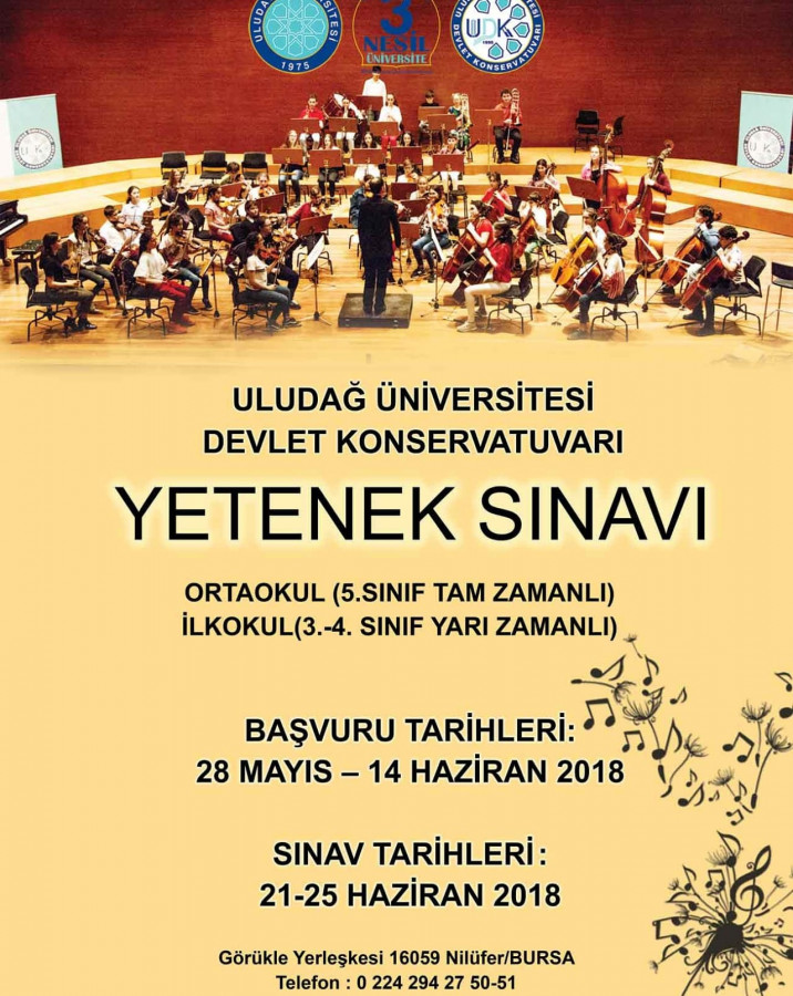 Uludağ Üniversitesi Devlet Konservatuarı yetenek sınavı, 21-25 Haziran tarihlerinde Görükle yerleşkesinde düzenlenecek. İlkokuldan 3 ve 4. sınıf, ortaokuldan ise 5. sınıf öğrencilerinin katılabileceği sınav için başvuru tarihleri, 28 Mayıs-14 Haziran tarihleri olarak belirlendi.