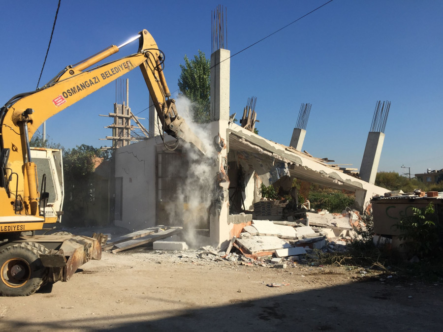 Osmangazi Belediyesi Yapı Kontrol Müdürlüğü ekipleri, Soğanlı Mahallesi Koza Sokağı'nda kaçak bir dükkanı yıktı. Geniş güvenlik tedbirleri altında gerçekleştirilen yıkımda herhangi bir olumsuzluk yaşanmadı. Belediye ekiplerinin geldiğini gören işyeri sahibi, yıkımı engellemek için arabasını kaçak olarak inşa ettiği dükkana park etti. Belediye ekiplerinin aracı dükkandan çıkarmasının ardından yıkıma başlayan ekipler, kaçak yapıyı kısa sürede yıktı.