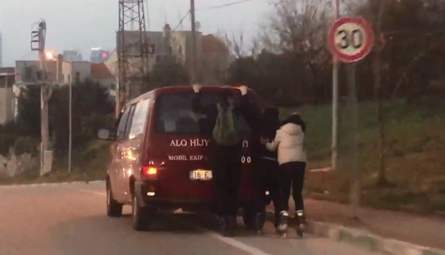 Bursa'nın Osmangazi ilçesinde 3 patenli genç önce bir kamyonet sonrasında da halk otobüsünün arkasına asılarak yaklaşık 10 kilometre yolculuk yaptı.