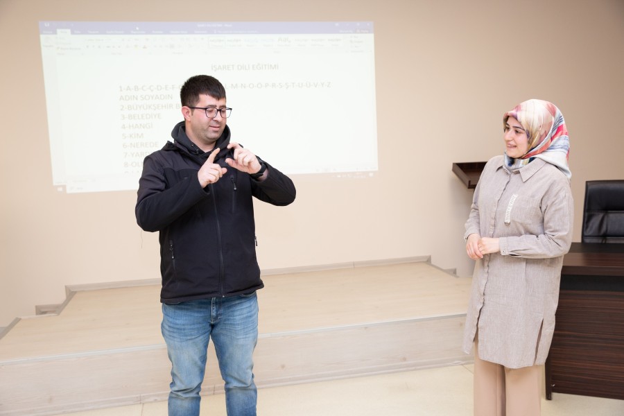 Büyükşehir Belediyesi, hizmet birimlerine gelen işitme engelli vatandaşlara daha etkili hizmet verilebilmesi amacıyla İnsan Kaynakları ve Eğitim Dairesi Başkanlığına bağlı Eğitim Şube Müdürlüğü organizasyonu ile Zabıta Destek Hizmetleri Şube Müdürlüğü bünyesinde özel güvenlik görevlisi olarak çalışan personele Kurum içi Eğitici kadrosundan Temra Aydın tarafından "Türk İşaret Dili Eğitimi" verildi.