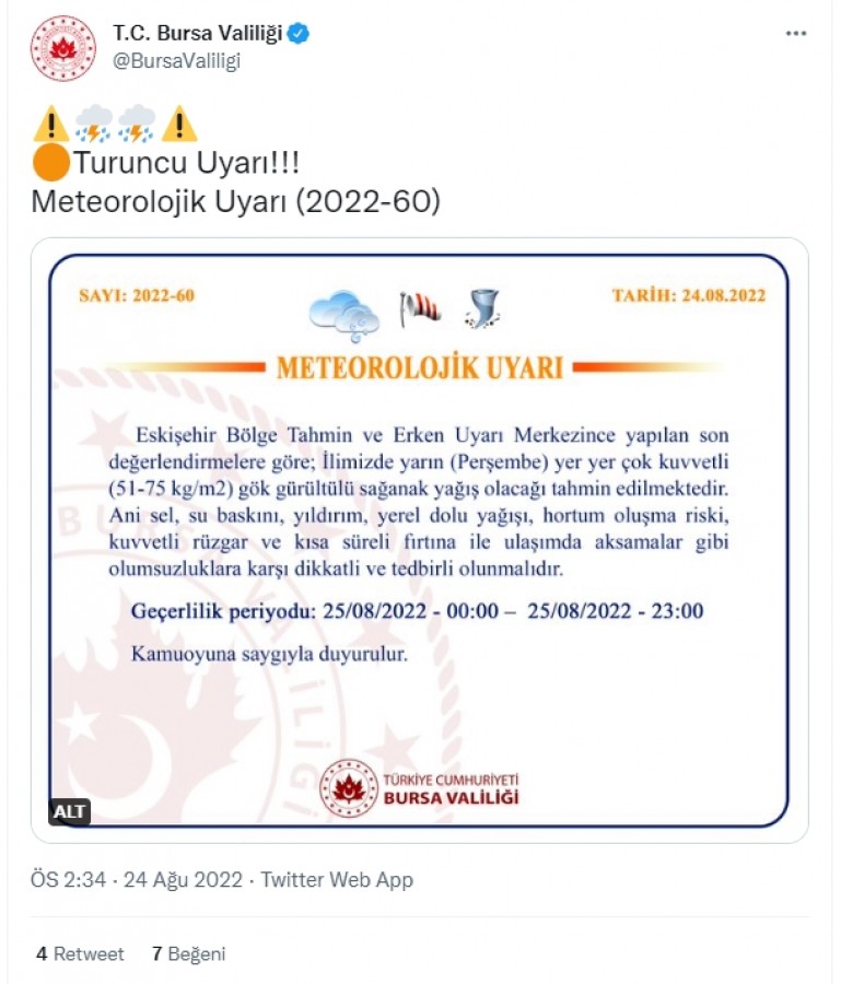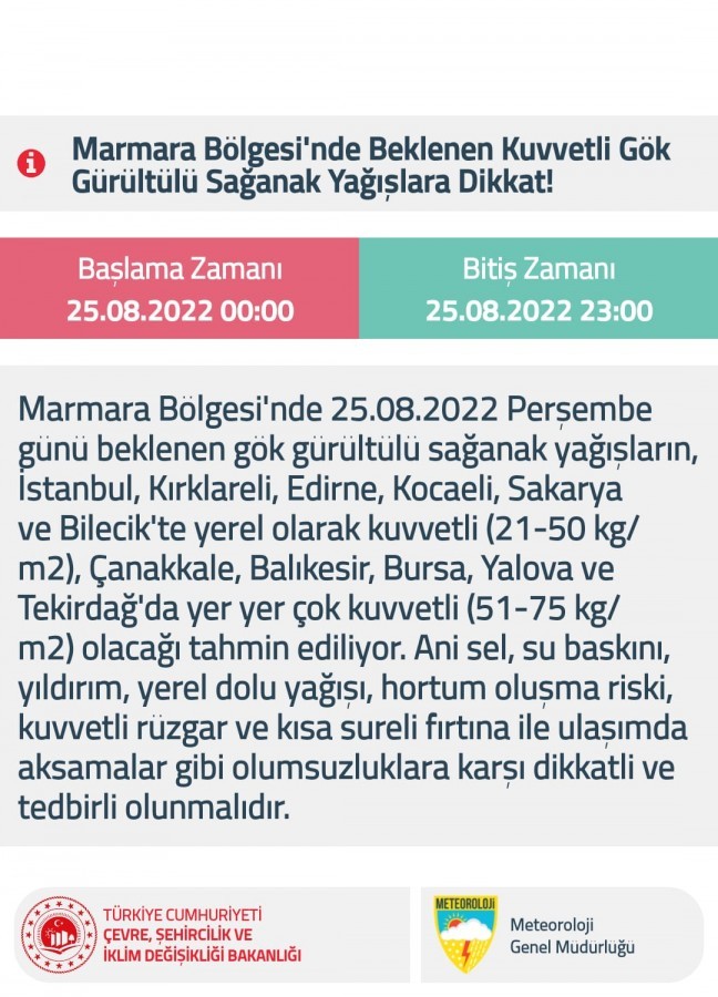 Meteoroloji'den yapılan uyarı şöyle; Marmara Bölgesi'nde 25.08.2022 Perşembe günü beklenen gök gürültülü sağanak yağışların, İstanbul, Kırklareli, Edirne, Kocaeli, Sakarya ve Bilecik'te yerel olarak kuvvetli (21-50 kg/ m2), Çanakkale, Balıkesir, Bursa, Yalova ve Tekirdağ'da yer yer çok kuvvetli (51-75 kg/ m2) olacağı tahmin ediliyor. Ani sel, su baskını, yıldırım, yerel dolu yağışı, hortum oluşma riski, kuvvetli rüzgar ve kısa sureli fırtına ile ulaşımda aksamalar gibi olumsuzluklara karşı dikkatli ve tedbirli olunmalıdır.