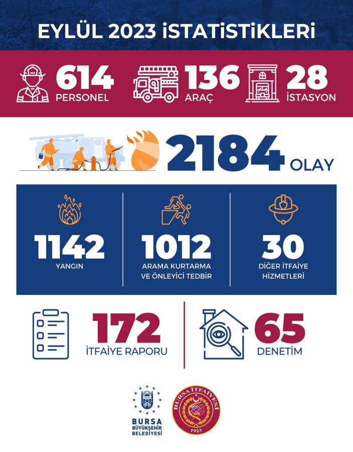 Bursa'da 28 istasyonda 614 personel, 136 araçla hizmet veren Büyükşehir Belediyesi İtfaiye Daire Başkanlığı'na bağlı ekipler, eylül ayında bin 142 yangın, bin 12 arama kurtarma ve önleyici tedbir, 30 diğer itfaiye hizmetleri olmak üzere 2 bin 184 olaya müdahale etti.