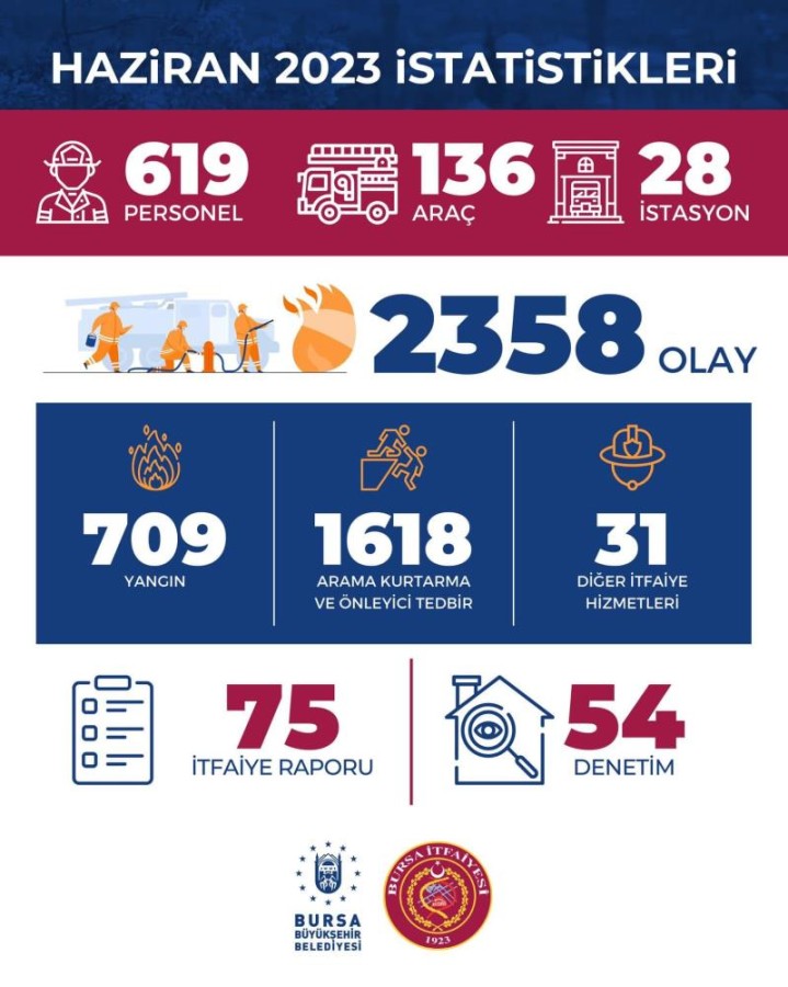 Bursa'da 28 istasyonda 619 personel, 136 araçla hizmet veren Büyükşehir Belediyesi İtfaiye Daire Başkanlığı'na bağlı ekipler, haziran ayında 709 yangın, bin 618 arama kurtarma ve önleyici tedbir, 31 diğer itfaiye hizmetleri olmak üzere 2 bin 538 olaya müdahale etti.