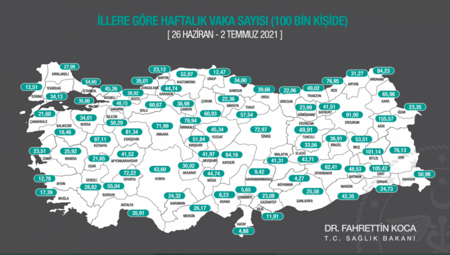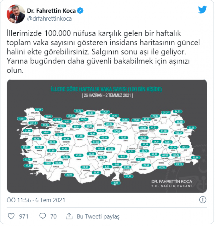Son bir haftada vaka sayısı en çok azalan illerimiz; Gümüşhane, Eskişehir, Artvin, Denizli ve Bartın. Salgının sonu aşı ile geliyor. Yarına bugünden daha güvenli bakabilmek için aşınızı olun. İllere göre haftalık vaka sayılarını açıklayan Bakan Koca, paylaşımında, "İllerimizde 100.000 nüfusa karşılık gelen bir haftalık toplam vaka sayısını gösteren insidans haritasının güncel halini ekte görebilirsiniz. Salgının sonu aşı ile geliyor. Yarına bugünden daha güvenli bakabilmek için aşınızı olun." ifadelerini kullandı.