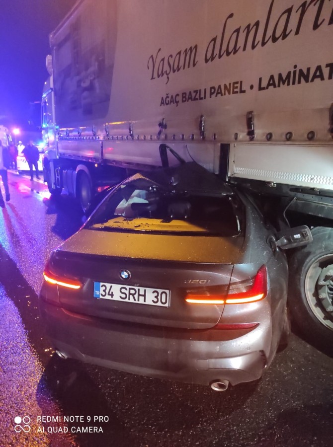 Kaza, 21:30 sıralarında Bursa Otobanı Selçukgazi Tünel mevkiinde meydana geldi. Edinilen bilgiye göre, Mahmut D. (22) idaresindeki 34 SRH 30 plakalı otomobil yağış nedeniyle kayganlaşan yolda sürücüsünün idaresinden çıkarak yine aynı istikamette seyir halindeki 10 ED 164 plakalı tırın dorsesine çarptı.