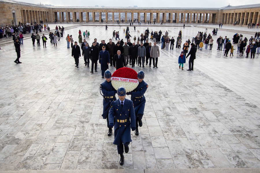 Bursa Ticaret Borsası'nın 100. kuruluş yıl dönümü dolayısıyla Yönetim Kurulu Başkanı Özer Matlı başkanlığındaki heyet, Anıtkabir'i ziyaret ederek, Ata'nın huzurunda saygı duruşunda bulundu.