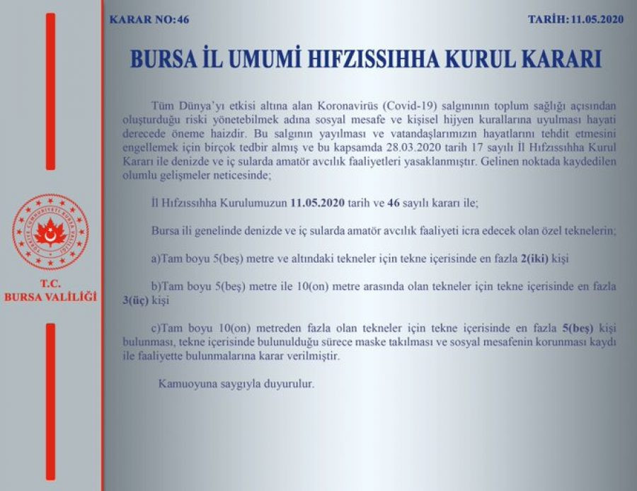Bursa Valiliğinden yapılan açıklamada özel tekneler için alınan yeni kararlar yayımlandı.