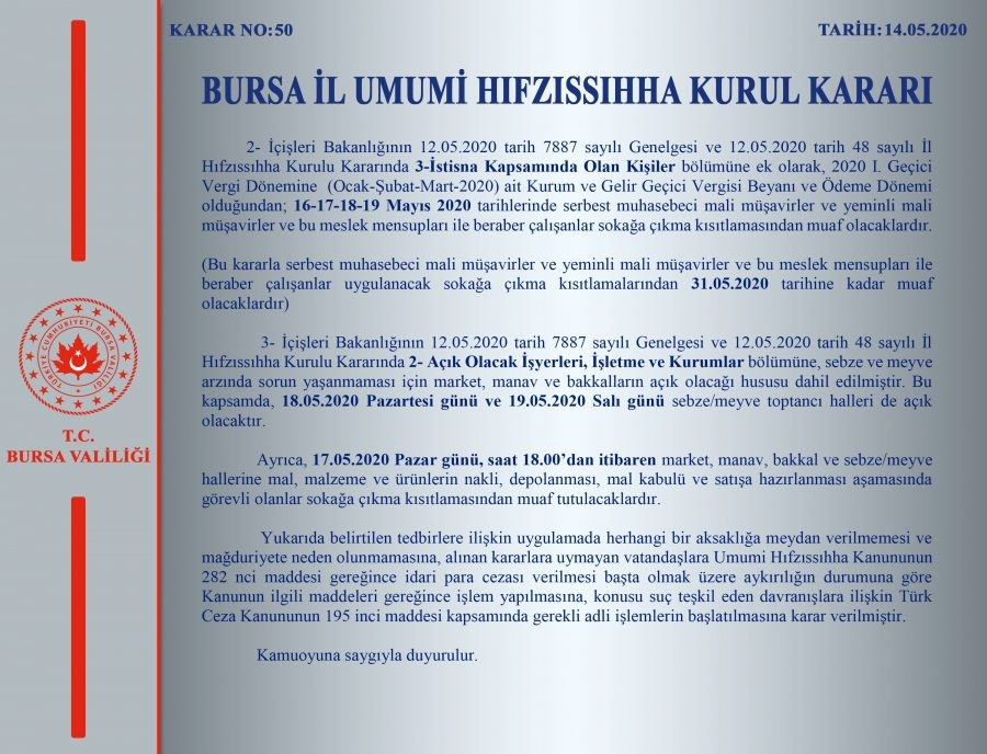 Alınan tedbirlerin, bulaşın yayılım hızının düşürülmesine olan etkisinin en üst noktaya taşınabilmesi amacıyla; 15-19 Mayıs 2020 tarihlerinde Bursa'da uygulanacak sokağa çıkma kısıtlamasına ilişkin İçişleri Bakanlığının 12.05.2020 tarih 7887 sayılı Genelgesi ve 12.05.2020 tarih 48 sayılı İl Hıfzıssıhha Kurulu Kararında istisnai durumlara yer verildiği belirtilen açıklamada şu bilgilere yer verildi.