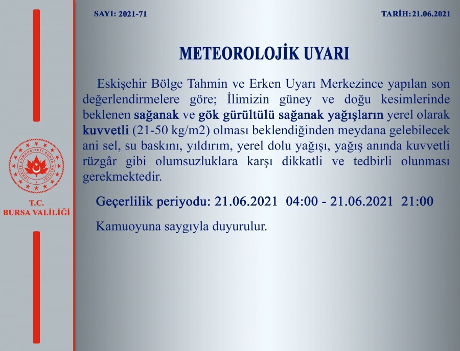 Eskişehir Bölge Tahmin ve Erken Uyarı Merkezince yapılan son değerlendirmelere göre; İlimizin güney ve doğu kesimlerinde beklenen sağanak ve gök gürültülü sağanak yağışların yerel olarak kuvvetli (21-50 kg/m2) olması beklendiğinden meydana gelebilecek ani sel, su baskını, yıldırım, yerel dolu yağışı, yağış anında kuvvetli rüzgâr gibi olumsuzluklara karşı dikkatli ve tedbirli olunması gerekmektedir.
