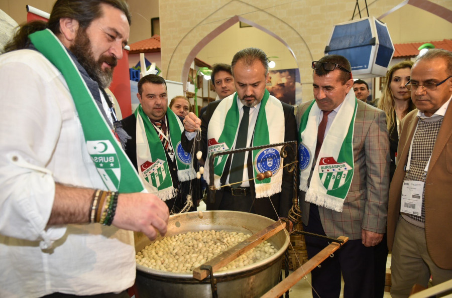 EMITT turizm fuarına, Bursa'nın yerel zenginlikleri damgasını vurdu. Büyükşehir Belediye Başkanı Alinur Aktaş'ın Bursalı basın mensuplarıyla birlikte gezdiği stantta, şehrin simge yapılarından Kozahan Mescidi, teleferik, Uludağ, ipek böceği üretim atölyesi, ipekten yapılmış ürünler, şehrin tarihi ve kültürel zenginliklerini konu alan tanıtım materyalleri yer aldı. Aktaş, stant ziyareti kapsamında Büyükşehir Belediyesi İpek Atölyeleri Genel Koordinatörü Mehmet Ünal'dan ipek böceğinin üretim safhaları ile ilgili bilgi aldı. İpek böceğinin 200-250 yıl önce Osmanlı döneminde yapılan üretimi, Aktaş'ın ziyareti sırasında turizm meraklılarına bir kez daha gösterildi. Aktaş, 'bereket olsun diye en sevilen kişiye yaptırılan' ipek halının tezgah kesim işlemini de stant ziyareti kapsamında gerçekleştirdi. EMITT Bursa platformuna uğrayan turizm profesyonellerine şehrin simge ürünlerinden kestane şekeri ikram edildi.