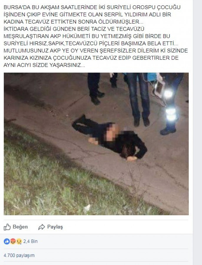 Paylaşım yapılan bir Suriyeli'nin tecavüz ve cinayet olayının yalan ve uydurma olduğu, kullanılan görselin de İstanbul'da 2 yıl önce işlenen bir cinayete ait olduğu öğrenildi.