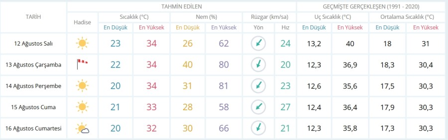 En serin gün 16 Ağustos Cumartesi 20°C ile, en sıcak gün ise 12-14 Ağustos 34°C ile yaşanacak. Poyrazın etkisiyle aşırı sıcaklar etkisini bir nebze de olsa düşürecek.