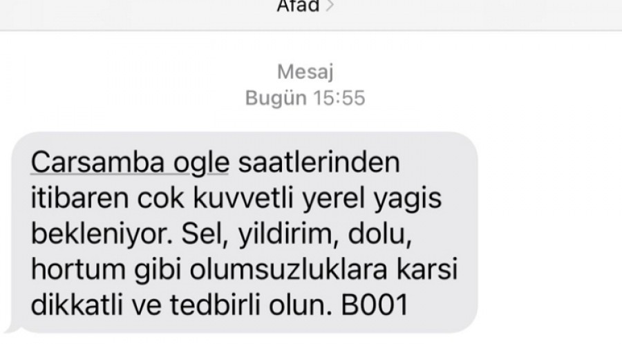 Meteoroloji'den yapılan uyarıda Bursa'da etkili olacak kuvvetli sağanak yağış ile birlikte görülebilecek su baskınlarına karşı tedbirli olunması istendi. Öte yandan AFAD'dan da telefonlara SMS uyarısı geldi