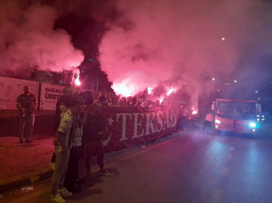 Bursaspor taraftarı, EURO 2020'de yarın Galler ile karşılaşacak olan A Milli Futbol Takımı'nı yalnız bırakmıyor. İtalya maçı öncesi Roma'da da desteklerini esirgemeyen yeşil-beyazlı futbolseverler, bu kez de Bakü'ye doğru yola çıktı. 2 bin kilometreyi karayoluyla kat edecek olan Bursaspor taraftarı, yolculuk öncesi de adeta gövde gösterisi yaptı. Yakılan meşaleler ve tezahüratlarla onlarca taraftar Azerbaycan'a gitti.