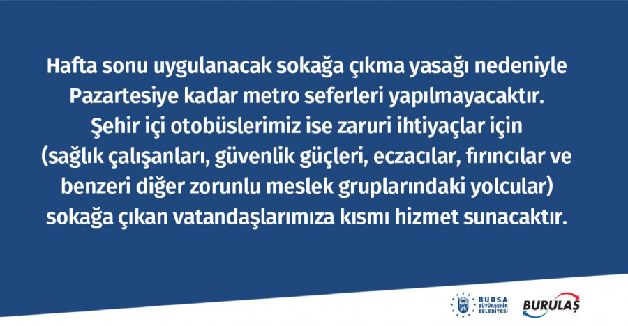 Bursa Büyükşehir Belediyesi, sokağa çıkma yasağı ile ilgili açıklamada bulundu. Metro seferlerinin pazartesi gününe kadar iptal edildiğinin bilgilendirildiği açıklamada şu ifadelere yer verildi.