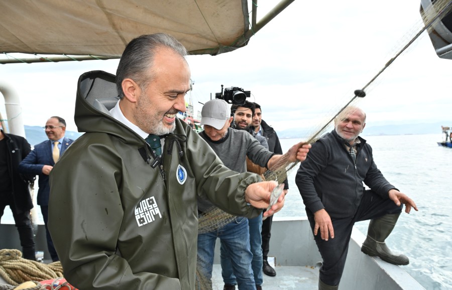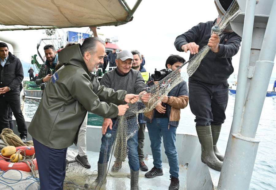 Bursa'da kırsal kalkınma hedefleriyle bugüne kadar tarımsal ve hayvansal üretime önemli destekler sağlayan Büyükşehir Belediyesi, destek kapsamına balıkçıları da aldı. Bursa Su Ürünleri Kooperatifleri Birliği'ne kayıtlı 148 teknede çalışan 310 tayfaya su geçirmez balıkçı tulumu ve çizme takımı dağıtıldı. Balıkçı teknesiyle denize açılan Büyükşehir Belediye Başkanı Alinur Aktaş, tarlalarda yaptığı hasat etkinliğinin bir benzeri de ağlara takılan balıkları toplayarak yapmış oldu.