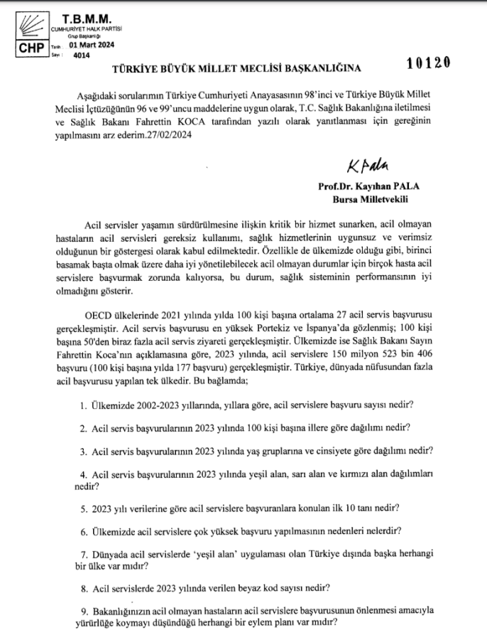 CHP Bursa Milletvekili Prof.Dr. Kayıhan Pala, 27 Şubat 2024 tarihinde verdiği bir soru önergesi ile Sağlık Bakanına ülkemizde acil servislere çok yüksek başvuru yapılmasının nedenlerini sormuştu. Pala'nın soru önergesinde "yeşil alan" olarak tanımlanan ve acil olmayan hastaların muayenesi ve tedavisi için ayrılan alanın, dünyada başka bir ülkede olup olmadığı da Bakan Koca'ya sorduğu sorulardan biriydi. Ancak Sağlık Bakanı acil servislere yüksek başvuru ve nedenlerine ilişkin toplam 9 sorunun hiçbirine, yanıt verme süresi geçtiği halde henüz yanıt ver(e)medi.