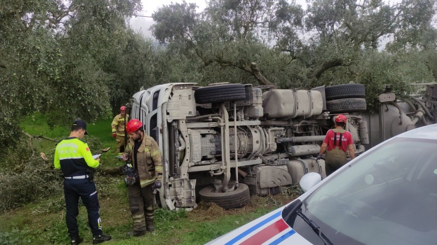Bursa'nın Orhangazi ilçesi İznik yolu üzerinde çimento malzemesi yüklü bir tanker kontrolden çıkarak zeytinliğe devrildi. Zeytin ağaçlarını parçalayarak duran tırın sürücüsü yaralandı.