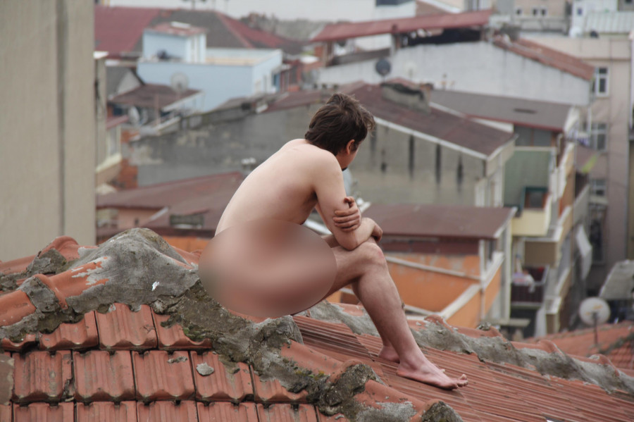 Kocaeli'nin İzmit ilçesinde psikolojik sorunları olduğu öğrenilen ve yedi katlı binanın çatısına çırılçıplak çıkan genç, inşaat sahibinin çay içme teklifi sonrasında çatıdan indi.