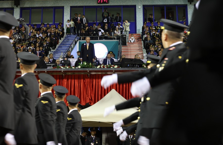 Subay ve astsubaylara hitap eden Erdoğan, "Sevgili genç subay ve astsubaylarımız; sizler bu toprağın sessiz nöbetini tutan o muhteşem iradenin yeni neferlerisiniz. Bugün ailelerinizin gururu, hocalarınızın sevinci, milletin umudusunuz. Yarın karakolda bir amirin, denizde bir komutanın, sahada bir ekibin parçası olacaksınız. Meslek hayatınız süresince inşallah bu millete ve devlete aşkla hizmet edeceksiniz. Gecenin karanlığında bir kapı çalınırsa, ışık siz olacaksınız. Denizin ortasında bir yardım çığlığı yükselirse, imdada siz koşacaksınız. Sınırda dalganın, yaylada rüzgârın, ovada toprağın diliyle konuşacaksınız. Görüyorum ki aranızda çok sayıda kadın subay ve astsubayımız var. Cesaretin cinsiyeti olmaz. Adanmışlığın ölçüsü olmaz. Kadın-erkek hepinizin mensubu olduğunuz kurumu şanla, şerefle temsil edeceğinden hiçbir şüphe duymuyorum.Sizlerden şunu da hiçbir zaman unutmamanızı rica ediyorum: Şöhret geçici, şeref kalıcıdır. Yetki geçici, itibar kalıcıdır. Mevki geçici, iz kalıcıdır. Sizin göreviniz iz bırakmaktır. İyilikte, adalette, merhamette devlete ve millete hizmette iz bırakmak. Her birinizin görevinizi bu şuurla yapacağına yürekten inanıyorum. Bu ocağın kültürü hakiki özgüven, sarsılmaz disiplin, sükunetli cesarettir. Sizden beklentimiz bu üç değeri aynı anda her şartta taşımanızdır. Buradaki her bir arkadaşımdan meslek hayatı boyunca bu değerlere sıkı sıkıya sarılmasını istiyorum. Hükümet olarak biz de sizin vazifelerinizi en iyi şekilde yerine getirmeniz için gerekli imkanları sağlamaya devam edeceğiz. Özellikle sokak çeteleriyle, suç örgütleriyle, zehir tacirleriyle mücadelemizi hukuk çerçevesinde kararlılıkla sürdüreceğiz. Kendini devletten, kanundan ve toplumu var eden temel değerlerden üstün gören her kim varsa hepsinin de tepelerine bineceğiz. Türkiye'nin huzuruna kastedenler, devletimizin tüm güvenlik güçlerinin çelikten iradesiyle karşılaşacaklardır. Rabbim şehit ve gazilerimizin emaneti bu aziz vatana hakkıyla sahip çıkabilmeyi hepimize nasip eylesin diyorum" diye konuştu.