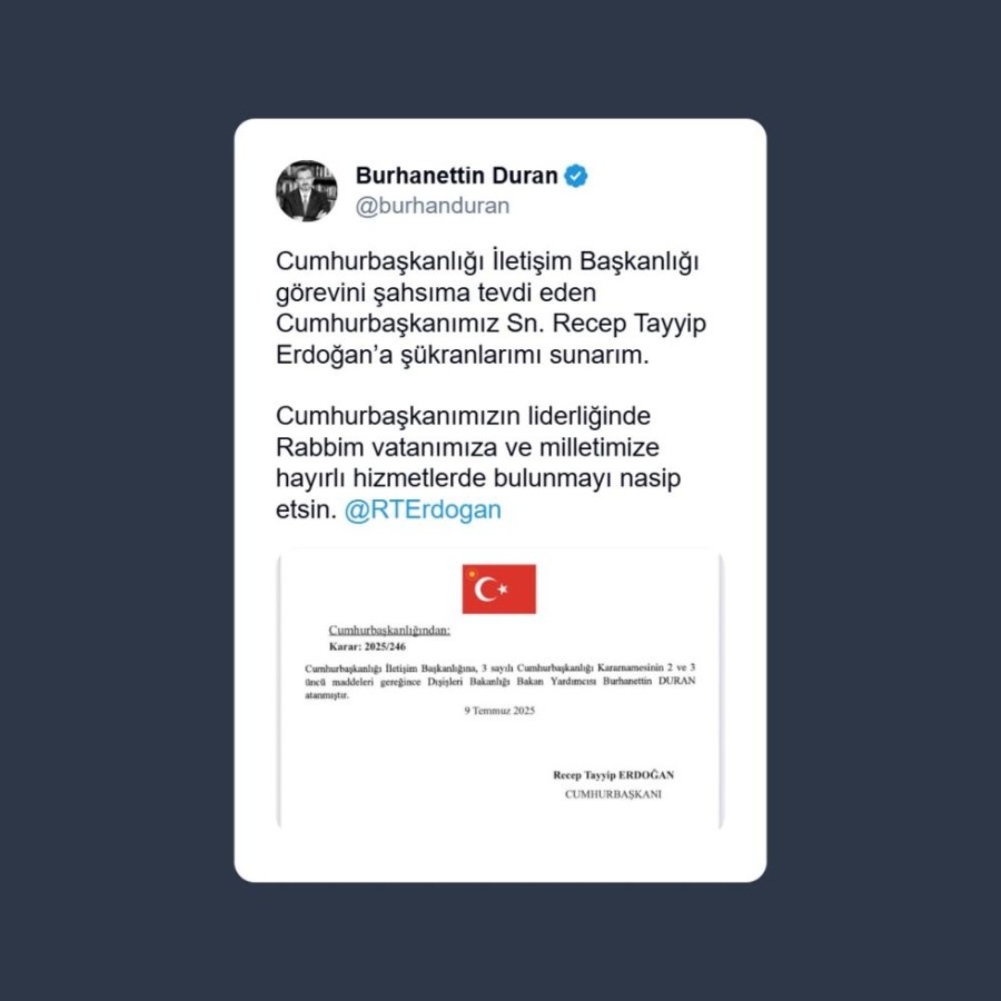 Cumhurbaşkanlığı İletişim Başkanlığı görevine Dışişleri Bakan Yardımcısı Burhanettin Duran getirildi. 9 Temmuz 2025 tarihli ve 2025/246 sayılı Cumhurbaşkanlığı Kararı ile Dışişleri Bakan Yardımcısı Burhanettin Duran, 3 sayılı Cumhurbaşkanlığı Kararnamesi'nin 2 ve 3'üncü maddeleri uyarınca Cumhurbaşkanlığı İletişim Başkanı olarak görevlendirildi.