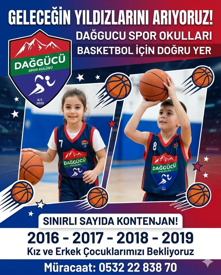 "Geleceğin Yıldızlarını Arıyoruz" sloganıyla çalışmalarını sürdüren Dağgücü Spor Okulları, basketbola doğru yerde başlamak isteyen çocuklara güvenli, disiplinli ve gelişim temelli bir eğitim ortamı sunuyor. Uzman antrenör kadrosu eşliğinde yürütülen programda temel teknik eğitimden maç tecrübesine kadar kapsamlı bir gelişim süreci uygulanıyor.