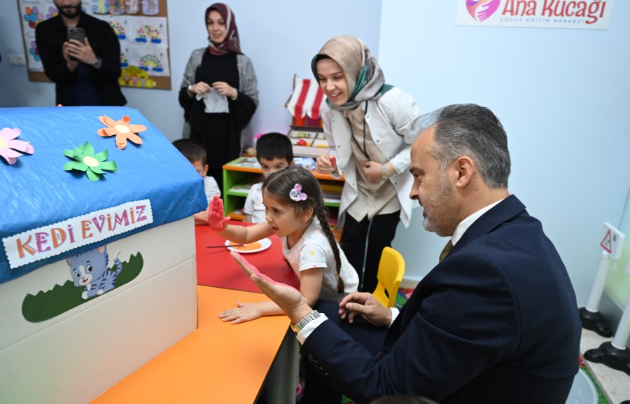 Bursa Büyükşehir Belediyesi'nin özellikle dar gelirli ailelerin çocuklarının da okul öncesi eğitim hizmetlerinden faydalanabilmesi amacıyla 2019 yılında başlattığı Ana Kucakları, zengin müfredatıyla da çocukları geleceğe en iyi şekilde hazırlıyor. Bu dönem eğitime başlayan Demirtaş Ana Kucağı ile sayıları 29'a ulaşan merkezlerde halen 3500'e yakın öğrenci eğitim görüyor. Fırsat buldukça Ana Kucaklarını ziyaret edip, çocuklarla buluşan Büyükşehir Belediye Başkanı Alinur Aktaş'ın son durağı da Demirtaş Ana Kucağı oldu. Hayvanları Koruma Günü kapsamında kedi evi yaparak, önemli bir farkındalığa imza atan Demirtaşlı miniklerle bir araya gelen Başkan Aktaş, sohbet ettiği çocuklara eğitim hayatlarında başarılar diledi.