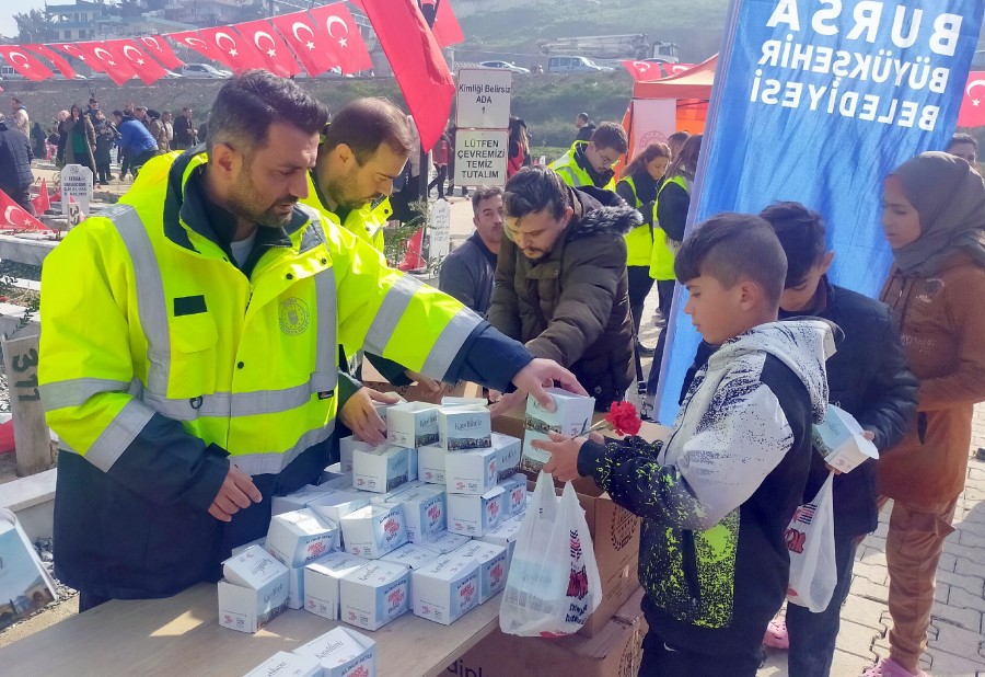 Geçtiğimiz yıl Kahramanmaraş merkezli yaşanan depremlerin ardından hemen bölgeye gidip, yaraların sarılması için önemli bir gayret gösteren Bursa Büyükşehir Belediyesi, asrın felaketinin yıl dönümünde depremzedelere moral için yine bölgedeydi. Depremzedelere kandil simidi ve süt dağıtan Büyükşehir Belediyesi ekipleri, konteyner kentteki kütüphaneye 1200 kitap teslim etti, özellikle çocuk ve gençlere moral için de 2 adet tenis masası ve 2 adet langırt masası kurdu.