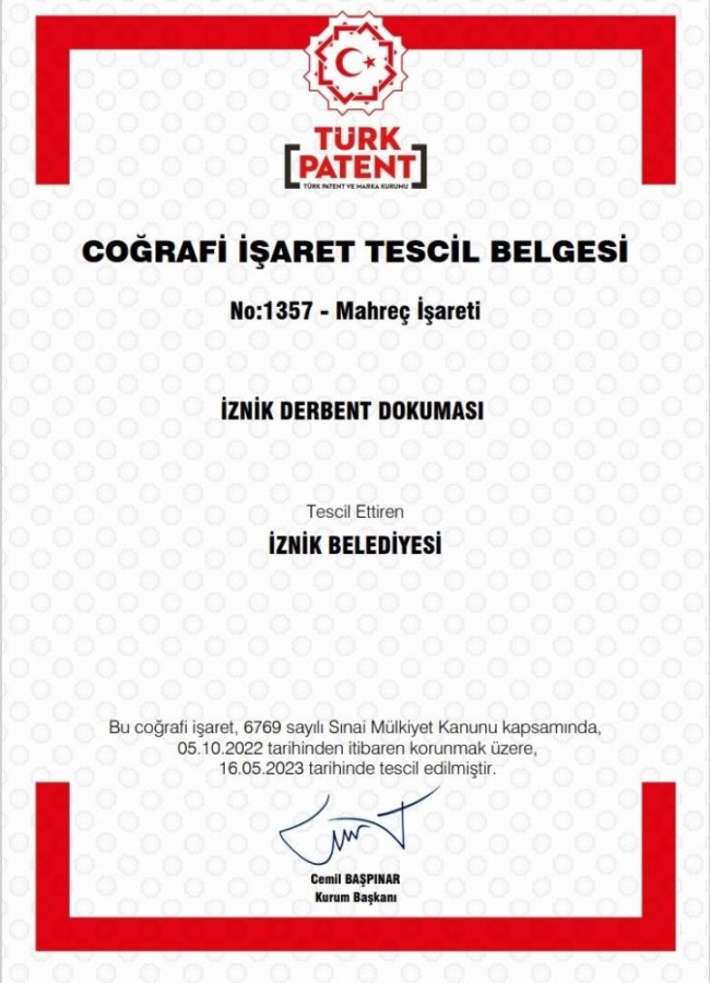 Kente özgü kültürel ve tarımsal ürünlerin korunması ve tanıtımı için çalışan İznik Belediyesi, İznik Müşküle Üzümü ve Müşküle İğne Oyasının ardından Derbent Dokumaları'nı da Türk Patent ve Marka Kurumu'nun Coğrafi İşaret belgesiyle tescilletti.