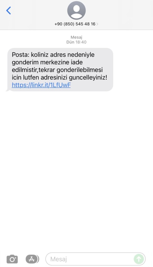 Siber korsanlar dolandırıcılıkta yeni yöntem geliştirdi. Kişilere SMS yoluyla gönderilen linklerle banka ve kredi kartı bilgilerini ele geçirmeye çalışıyorlar. Kandırılmaya çok müsait olarak dizayn edilen yöntemde kişilere açık bir numaradan SMS gönderiliyor. Mesajda 'Koliniz adres nedeniyle gönderim merkezine iade edilmiştir. Tekrar gönderilmesi için lütfen adresinizi güncelleyin' ifadelerinin ardından bir link bulunuyor. Kullanıcılar linke tıkladıklarında yeni bir sayfada adres bilgilerini güncellemeleri ve paketin gönderimi bahane edilerek bir ücret talep ediliyor. Sonraki adımda kişinin kart bilgileri isteniyor.