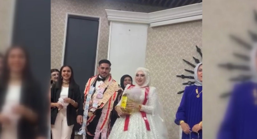 Erzincan'da düzenlenen bir nikah töreninde gelin ve damada takı merasiminde 5 litrelik Ayçiçek yağı takıldı.