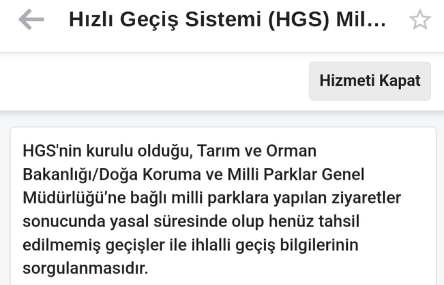 HGS'nin kurulu olduğu, Tarım ve Orman Bakanlığı/Doğa Koruma ve Milli Parklar Genel Müdürlüğü'ne bağlı milli parklara yapılan ziyaretler sonucunda yasal süresinde olup henüz tahsil edilmemiş geçişler ile ihlalli geçiş bilgilerinin sorgulanmasıdır.