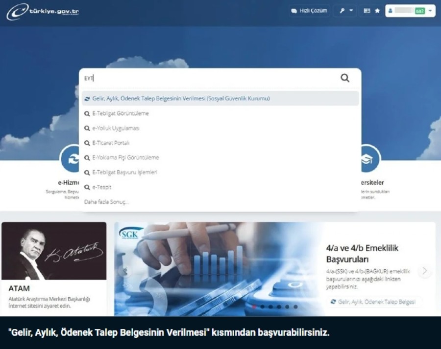e-Devlet'te arama çubuğuna EYT yazdıktan sonra "Gelir, Aylık, Ödenek Talep Belgesinin Verilmesi" kısmından başvurunuzu yapabilirsiniz. Buradan 'Yeni Başvuru' adımından sizden istenen gerekli bilgileri doldurarak başvurunuzu tamamlayabilirsiniz.