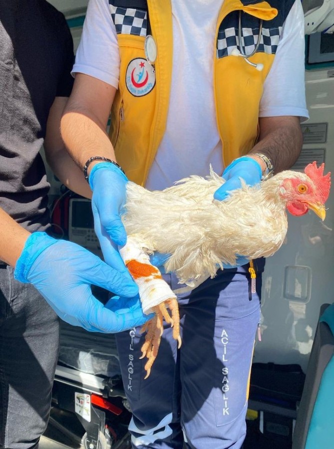 Bursa'da 112 Sağlık çalışanları, sıra dışı bir olaya müdahale etmenin tecrübesini yaşadı. Çitlerden atlarken ayağı kanayan tavuk, sahibi tarafından sağlık çalışanlarına getirilerek tedavi ettirildi.