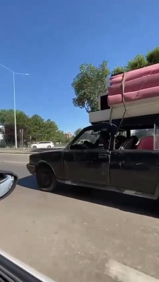 Ehliyetsiz sürücü otomobilin tavanında koltuk taşıdı