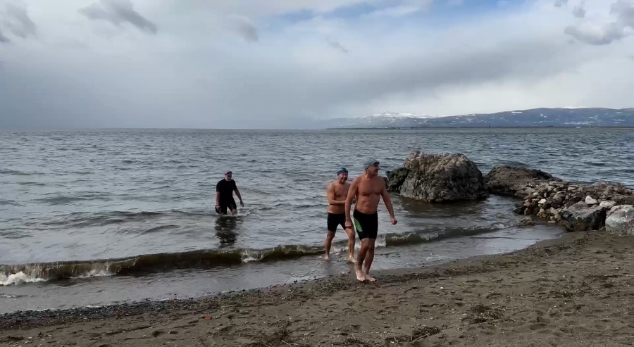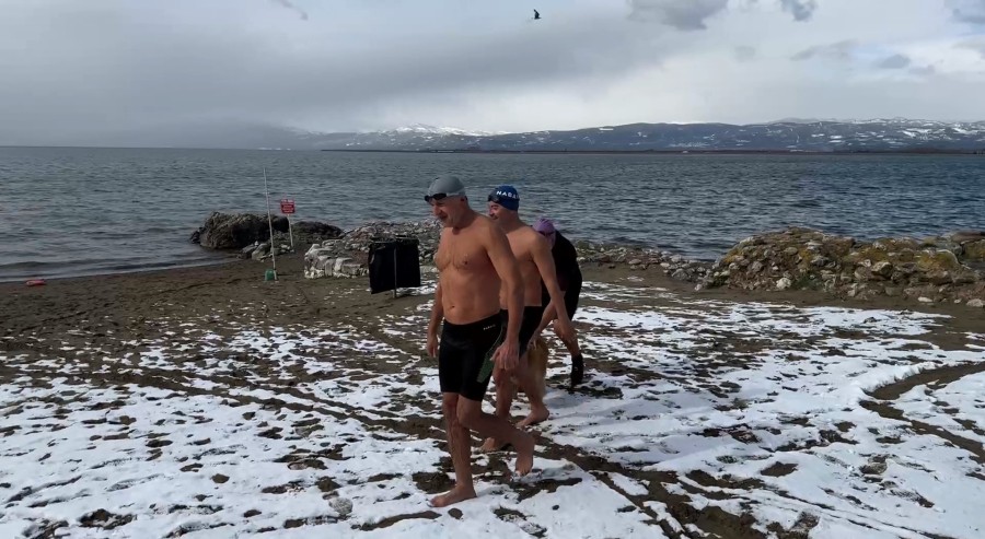 İznik'te kendilerine 'İnciraltı Sanatörleri' adını veren bir grup, yer yer devam eden kar yağışına ve soğuk havaya aldırmadan İznik Gölü'nde suya girdi. 3 yıldır yaz kış demeden göle giren grup, İznik'te etkisini sürdüren kar yağışı ve eksi 3'ü gösteren soğuk havada geleneği yine bozmadı.
