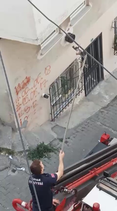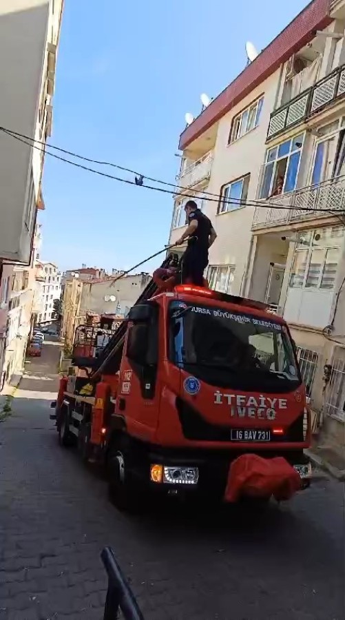 Yıldırım ilçesi Emirsultan Mahallesi Akgün Sokak üzerinde elektrik kablosuna konan kuş, ayağı takıldığı için hareket edemedi. Kurtulmak için çırpınan kuşu fark eden vatandaşlar itfaiye ekiplerini arayarak yardım istedi.