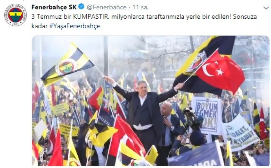 Spor Toto Süper Lig ekiplerinden Fenerbahçe ve Trabzonspor, 3 Temmuz ile ilgili sosyal medya hesaplarından videolu paylaşımlarda bulundu. Sarı-lacivertliler, "3 Temmuz bir KUMPASTIR, milyonlarca taraftarımızla yele bir edilen! Sonsuza kadar Yaşa Fenerbahçe" paylaşımını yaparken, bordo mavililer ise "O zaman bir kez daha yüksek sesle haykırmanın zamanıdır! 2010-2011 sezonunun 'tertemiz' şampiyonu Trabzonspor!" ifadelerini kullandı.