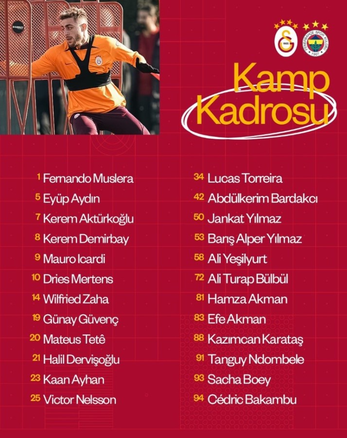 "Fernando Muslera, Eyüp Aydın, Kerem Aktürkoğlu, Kerem Demirbay, Mauro Icardi, Dries Mertens, Wilfried Zaha, Günay Güvenç, Mateus Tete, Halil Dervişoğlu, Kaan Ayhan, Victor Nelsson, Lucas Torreira, Abdülkerim Bardakcı, Jankat Yılmaz, Barış Alper Yılmaz, Ali Yeşilyurt, Ali Turap Bülbül, Hamza Akman, Efe Akman, Kazımcan Karataş, Tanguy Ndombele, Sacha Boey, Cedric Bakambu."