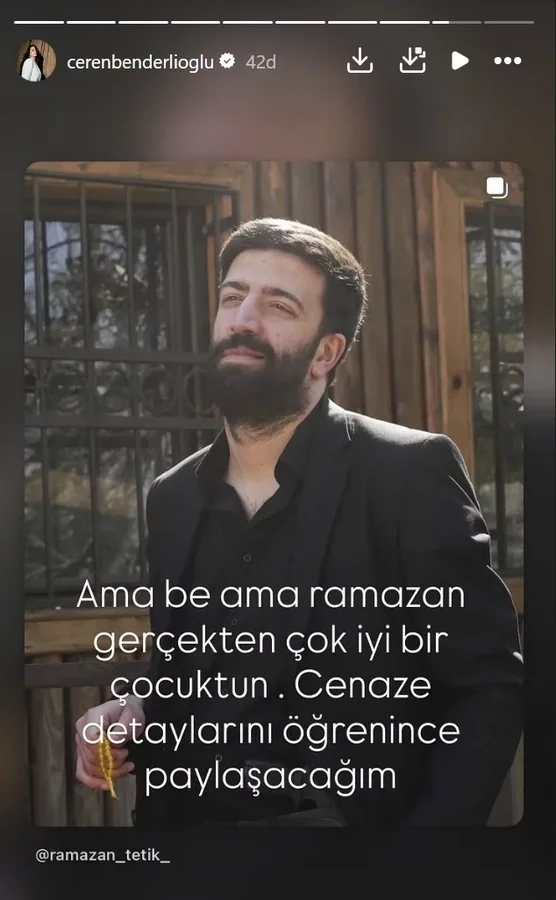 "Eşref Rüya" dizisinde rol alan oyuncu Ceren Benderlioğlu, sosyal medya hesabından yaptığı paylaşımla genç oyuncu Ramazan Tetik'in hayatını kaybettiğini açıkladı. Benderlioğlu, paylaşımında Tetik için duygusal ifadeler kullanarak cenaze detaylarını daha sonra paylaşacağını belirtti.